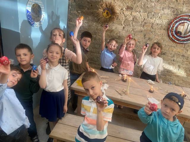 Учні 1-А класу гімназії №48 старанно підготувалися до Великодня: розфарбували яєчка з математичним завданням, зробили листівки для рідних, прикрасили пластиліном курчаток, а також власноруч розписали писанки в гончарній майстерні «Яр».