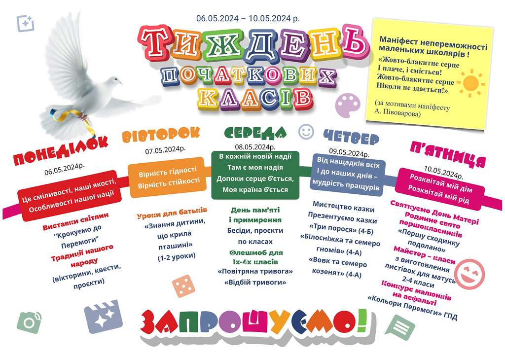 До Дня пам'яті та перемоги над нацизмом у Другій світовій війні 1939–1945 років в рамках тижня початкової школи 08 травня 2024 року учні 4-х класів підготували для своїх наймолодших друзів флешмоби «Повітряна тривога», «Відбій повітряної тривоги», де змогли нагадати в ігровій формі основні правила поведінки, а малеча запропонувала долучитися до флешмобу «Україна єдина, красива і сильна».