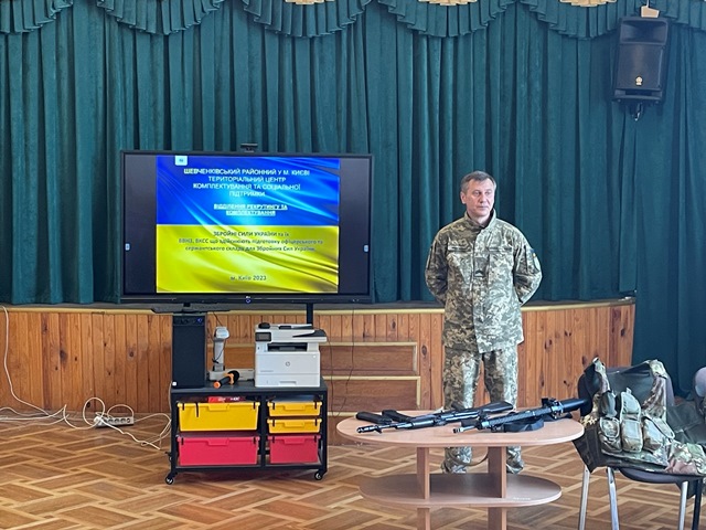 25 травня 2023 року інструкторами відділення рекрутингу та комплектування Шевченківського районного у місті Києві територіального центру комплектування та соціальної підтримки були проведені відкриті профорієнтаційні уроки «Захисту України» для учнів 9-10 класів гімназії №48.