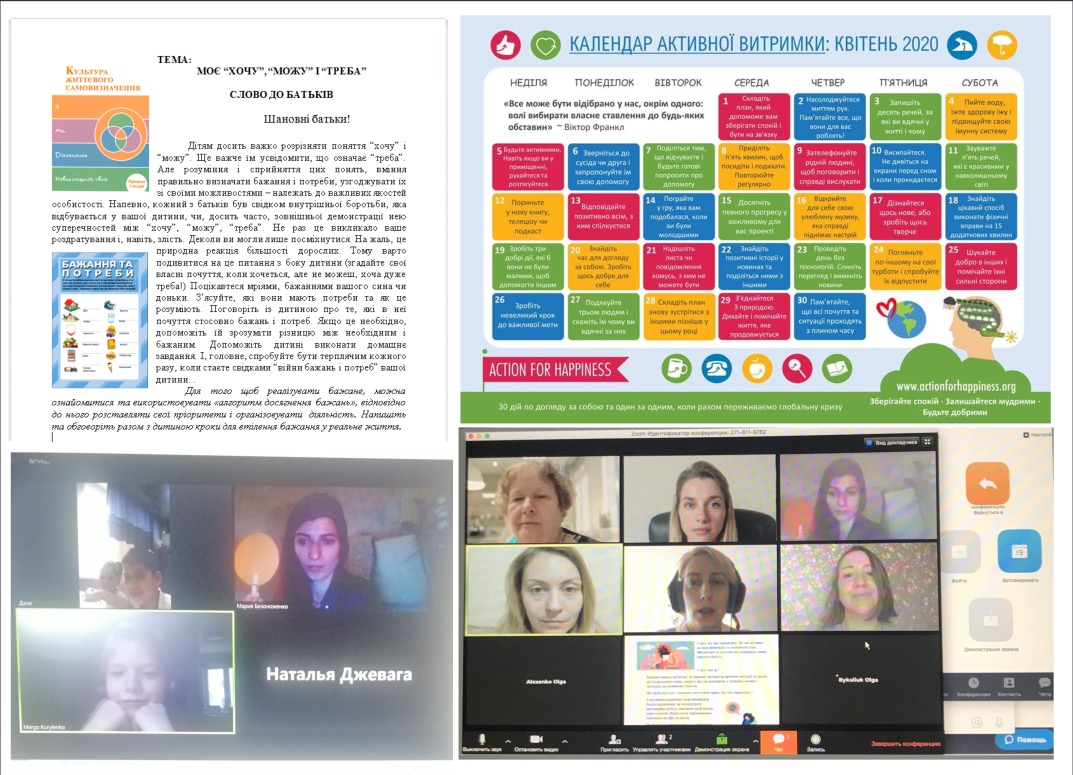 Під час каратнину соціально-психологічна служба гімназії 48 змінила свій формат роботи та за допомогою новітніх технологій застосовує різноманітні форми взаємоздіі з учнями, батьками та вчителями. Однією з таких форм є проведення Zoom-конференцій з батьками, де обговорюються питання "як подолати стрес під час карантину, як він впливає на наш фізичний та емоційний стан", "як ефективно працювати вдома і зберігти здоров'я в період карантину". Також за запитом проводяться психологічні консультації у різноманітних онлайн-сервісах, месенджерах та по телефону. В дистанційну роботу були інтегровані розвиваючі заняття за авторською програмою "Культура життєвого самовизначення", де через основний елемент двустороннього спілкування з батьками "Слово до батьків" підтримується головний взаємозв'язок: школа-сім'я- дитина. Сайт гімназії постійно поповнюється різноманітними цікавими матеріалами: порадами для батьків та учнів, практичними завданнями, презентаціями, тематичними казками тощо.