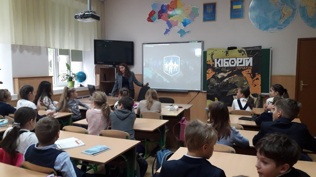 До дня Захисника України 09 жовтня 2019 року гімназисти 5-Б класу мали можливість поспілкуватися з захисниками донецького аеропорту – Олександром Васильовичем Басенко – командиром бойової машини та Дмитром Петровичем Козирем, які були нагороджені нагрудним знаком «За оборону донецького аеропорту». Під час вільного спілкування гімназисти мали можливість задати багато запитань про те, як українським військовим вдалося утримувати старий та новий термінали Донецького аеропорту. Бої за Донецький аеропорт стали символом незламності та бойового духу українського війська, а захисники терміналів отримали прізвисько - «Кіборги».